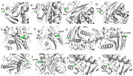 Structural position diagram of wild type RML and mutants. (A,C,E,G,I,K) the structure of wild type; (B,D,F,H,J,L) the structure of mutants D39M, D44L, Q119L, N120M, E230I, and N264M. Mutation sites are represented as green sticks.