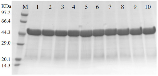 To further enhance the enzyme’s properties, we strategically combined beneficial single-point mutations. Two two-point mutants, N120M/E230I and E230I/N264M, and a triple mutant, N120M/E230I/N264M, were generated by combining N120M or N264M and E230I, which had the highest residual activity. All combination mutants were expressed successfully in a soluble form in E. coli, showing molecular weights aligned with predicted values and purity levels surpassing 90% (see Figure 3).