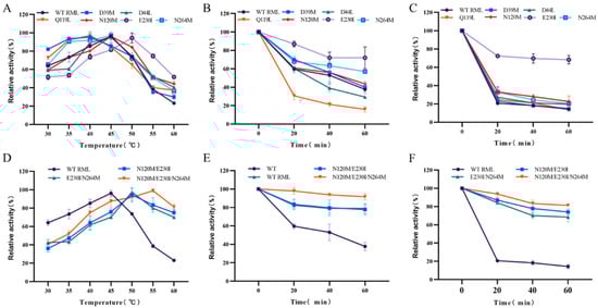 Characteristics of wild-type RML and mutants. (A) Optimum temperature of single-point mutants; (B,C) thermostability of single-point mutants at 50 °C (B) and 55 °C (C); (D) optimum temperature of combined mutants; and (E,F) thermostability of combined mutants at 50 °C (E) and 55 °C (F).