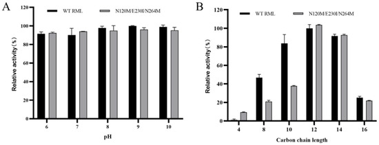 The pH stability of wild-type RML and the mutant variant N120M/E230I/N264M was assessed over a pH range of 6.0 to 10.0. Both variants demonstrated considerable tolerance to alkaline conditions, retaining approximately 90% of their enzymatic activity at pH levels of 8.0 to 10.0 (see Figure 5A). Substrate specificity studies indicated that both the wild-type RML and the mutant N120M/E230I/N264M preferentially utilized p-nitrophenyl laurate (C12) as their primary substrate. The mutant N120M/E230I/N264M displayed higher specificity for both C12 and C14 (p-nitrophenyl myristate) compared to the wild type (refer to Figure 5B). In general, lipases are known to exhibit optimal activity against water-insoluble long-chain triacylglycerols (C8–C18) whereas esterases tend to hydrolyze water-soluble short-chain fatty acid esters (C8) [55]. Consequently, RML can be accurately classified as a bona fide lipase based on its substrate specificity.