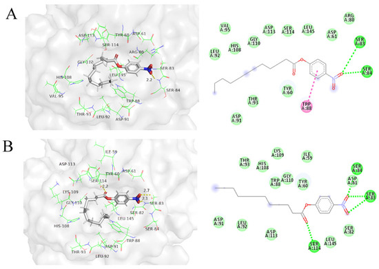 Analysis of molecular docking. Analysis of interactions between the wild type (A), N120M/E230I/N264M mutant (B), and pNPL. pNPL is shown as a gray sticks, the residues of 5 Å around pNPL shown as green line. Residues involved in Van der Waals forces are shown in light green, those involved in hydrogen bonding are dark green, and those involved in π–π stacking interaction are pink.