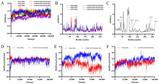 Analysis of Interactions between the wild type, N120M/E230I/N264M mutant, and pNPL. RMSD (A) and RMSF (B) values of the wild type and N120M/E230I/N264M mutant at 298 K, 313 K, and 343 K. (C) The positions of nineteen residues predicted by FoldX (shown by RMSF values). (D–F) The binding energy of the ligand pNPL to WT RML and mutant N120M/E230I/N264M during 10 ns of molecular dynamics at 298 K (D), 318 K (E), and 328 K (F).