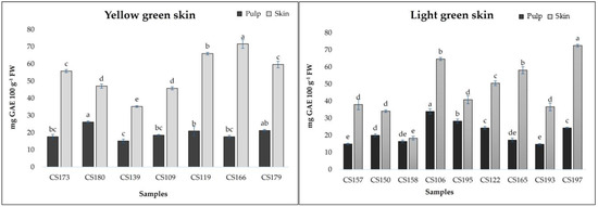 Total phenolic compounds of pulp and skin in “light-skinned breba accessions”. The data are presented as means. Different letters indicate significant differences at p < 0.05, as determined by Tukey’s post hoc test.