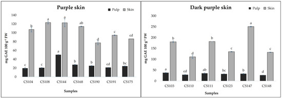 Total phenolic compounds in pulp and skin of “dark-skinned fig accessions”. The data are presented as means. Different letters indicate significant differences at p < 0.05, as determined by Tukey’s post hoc test.
