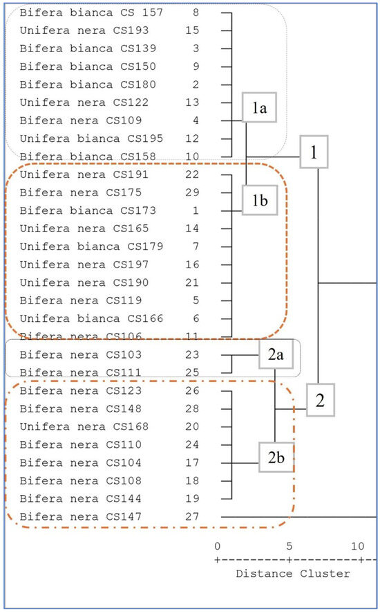 Cluster analysis based on the statistical analysis of 29 morphological traits of fig accessions, based on the distance and the ‘complete linkage method’. Group 1 includes 19 accessions with a lower TPC content (1a: 9 accessions with the lowest TPC values; 1b: 10 Accessions with slightly higher TPC levels than 1a); Group 2 includes 10 accessions with a higher TPC content (2a: 2 accessions with the highest level of TPC; 2b: 8 Accessions with high level of TPC, but lower than 2a).