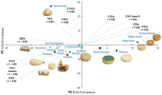 It is well known that goat milk also has a different fatty acid profile to cow’s milk [42] and other dairy species [43], and that what mainly distinguishes caprine milk is the relative abundance of short-chain, even, SFAs, except for the shortest, C4:0 [28,44,45]. This well-established knowledge can be seen in the common names of these fatty acids: caproic acid (C6:0), caprylic acid (C8:0), and capric acid (C10:0). Capra is the Latin word for a goat. In contrast, goat cheeses, like goat milk, have the lowest contents of butyric acid (C4:0), palmitic acid (C16:0), and stearic acid (C18:0), and of branched-chain SFAs, often assumed to be indicators of microbial fermentation in the rumen. The second principal component illustrated in Figure 1 (representing 22.1% of all the variability) seems mainly related to the species of the dairy animal, with the goat cheeses having a very high (positive) score and all the cows’ cheese categories having small to negative scores.