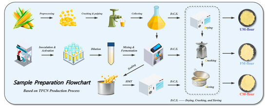 Based on the production process of TFCN, the preparation processes of unmodified corn flour (UM-flour), fermented modified corn flour (FM-flour), and fermented and HMT combined modified corn flour (CM-flour) were designed, as shown in Figure 1.