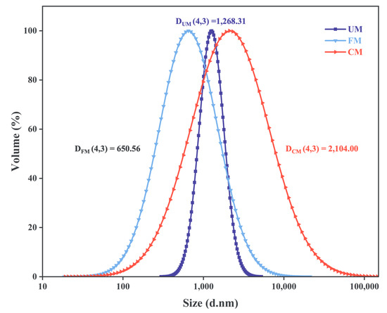 Particle size distribution of the UM, FM, and CM.