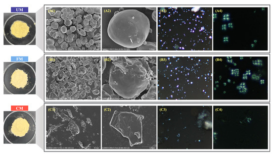 Starch physical appearance, SEM (1.0 k/6.0 k), Polarizing microscope images of UM (A1–A4), FM (B1–B4), and CM (C1–C4).