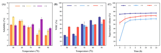 Solubility (A) and WHC (B) at different temperatures (50–90 °C) and the Retrogradation properties (C) at different time points (0–24 h) of UM, FM, and CM.