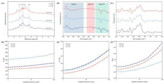 XRD (A), FTIR in the range of 4000–400 cm-1 (B), FTIR deconvolution curves in the range of 1200–800 cm-1 (C), Storage modulus G′ (D), Loss modulus G″ (E) and Loss factor Tan δ (F) of UM, FM, and CM.