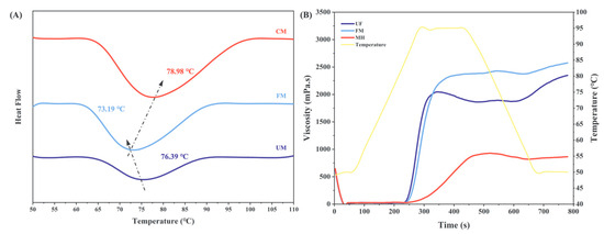 Figure 4 A and B shows the solubility and water holding capacity (WHC) of the samples at 50–90 °C, respectively. As shown in the figure, the solubility of the UM group increases first and then decreases with increasing temperature, and the solubility is the highest at 60 °C. WHC increases continuously with increasing temperature, which may be because high temperature promotes the efficiency of water molecules binding to polar groups on starch chains, resulting in an increase in WHC, but starch granules also absorb water and swell, limiting dissolution, resulting in a decrease in solubility [32].