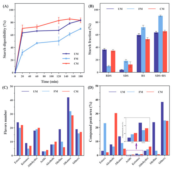 Further analysis of the flavor content in Supplementary Materials, where ND stands for “not detected”, revealed that the UM group noodles were rich in flavor components, with a high proportion of alkenes and alkanes, commonly associated with the natural aroma of plant-based foods. However, these compounds lack extensive transformation, contributing only a raw and neutral flavor profile. After fermentation modification, FM group noodles showed a significant increase in ester content, with a relative reduction in other flavor compounds. This indicates that fermentation simplifies the aroma composition and enhances characteristic flavor components. After the combined modification with HMT, the proportion of alcohols increased in CM group noodles, while esters and aldehydes were retained, along with newly generated ketones and acids from fermentation. This enriches the noodles’ flavor profile, potentially improving sensory appeal.