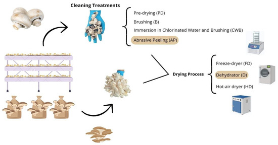 A scheme of the fungi processing is shown in Figure 1. The Agaricus bisporus stems, from the Sylvan A15 strain, were provided by Cultivos Riojal (Autol, La Rioja, Spain) and were freshly cut after the fruiting bodies were collected. A. bisporus was cultivated on a substrate primarily composed of wheat straw, chicken manure, and recirculated process water, with temperatures maintained between 15 and 19 °C and relative humidity ranging from 87 to 91% over a growth period of 8 days. The samples were stored at 4 °C for no longer than 5 days before the cleaning treatments were applied. The Pleurotus ostreatus stems from the Sylvan SPOPPO strain were supplied by Micotec SA (Autol, La Rioja, España) and were freshly cut after the fruiting bodies were collected. P. ostreatus was cultivated on a substrate primarily composed of wheat straw, with temperatures ranging from 18 to 23 °C and relative humidity between 90 and 95% over a growth period of 10 days. The samples were kept at 4 °C for no more than 5 days until the drying process.