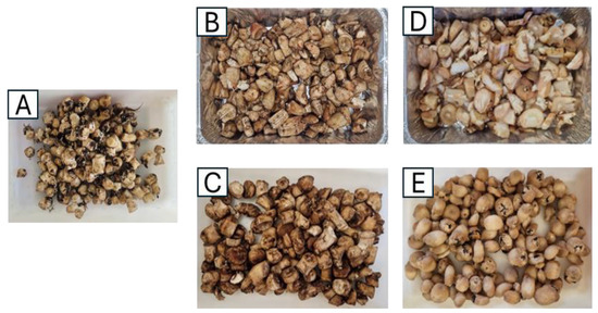 ABS were cleaned in this method with pressurized water and an abrasive surface. This method was carried out in an automated peeling system (PP-12, Sammic, Serhs Equipment, Madrid, Spain). The automated peeling has a capacity of 30 kg and a rotating disk with sanding material that allows for the peat to be removed together with pressurized water. The abrasion was applied for 30 s for each 0.5 kg of ABS; these conditions were selected for this experiment based on previous studies carried out by the research group, in which the physical structure of the mushroom co-products were considered as well as energy and water consumption. Figure 2 shows the result.