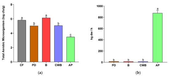 Figure 3a shows the total aerobic count in CF, PD, B, CWB, and AP. According to these results, the microbial analyses of the stems under study were influenced by cleaning treatments (p < 0.05). There is no difference between CF and B (p < 0.05), with aerobic microorganism average counts of 5.82 and 6.14 log cfu/g, respectively, which is on the range analysis of commercialized A. bisporus in EU (6-8 log cfu/g) [44,45]. Even when B registered the highest (p < 0.05) yield and protein content (Table 1) compared to other cleaning processes, these results showed the inefficiency of the B treatment for washing and preserving food security. Additionally, there is no difference between PD (5.03 log cfu/g) and CWB (5.06 log cfu/g), and both of them were higher than AP (3.48 log cfu/g) (p < 0.05). Aerobic microorganisms are indicators of the hygienic quality of products and are also indicative of the potential contamination by pathogenic microbial agents associated with the risk of clinical manifestations [45]. Considering this assertion and the high moisture content of the co-products, which could lead to microbiological growth, AP could be an appropriate cleaning treatment for ABS.