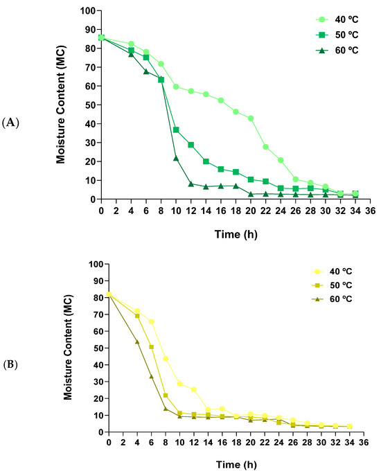 Figure 4 shows the moisture content profile during the dehydration of the samples at different temperatures. Higher drying temperatures generally lead to a quicker reduction in moisture content. In ABS (Figure 4A), the effect of temperature on moisture content was more pronounced than in POS (p < 0.05). At 40 °C, the moisture content remained above 10% until 28 h of drying, while at 50 °C, this threshold was achieved after 22 h, and at 60 °C it was reached in just 12 h (p < 0.05). To attain a moisture content below 5%, 32 h was required at 40 °C, 24 h at 50 °C, and 20 h at 60 °C (p < 0.05), indicating a substantial acceleration in the dehydration kinetics with increasing temperature. These results differ significantly from those observed in previous studies, where only 2.7 h at 50 °C was required to achieve a moisture content of 11% and 4.5 h to 6% [50,51]. This may be because, in those studies, sliced fruiting bodies were dried rather than non-sliced stems. For POS (Figure 4B), the moisture content dropped below 10% in 18 h at 40 °C, while at 50 °C and 60 °C, this level was reached at 16 and 10 h, respectively (p < 0.05). These results are consistent with those reported by Daud N. et al., where 12 h was required to dry the stems to 10% moisture at 40 and 50 °C, while only 6 h was needed at 60 °C [52]. Furthermore, there was no statistically significant difference (p < 0.05) between 50 °C and 60 °C in terms of achieving a moisture content below 5% (24 h), whereas 28 h was necessary at 40 °C. These results suggest that 60 °C may represent the optimal drying temperature, as it substantially reduces the processing time and consequently lowers energy consumption. However, it is necessary to evaluate the potential impact of this higher temperature on the physicochemical properties of the resultant flours, particularly regarding the content of bioactive compounds, which may be sensitive to thermal degradation during the drying process.