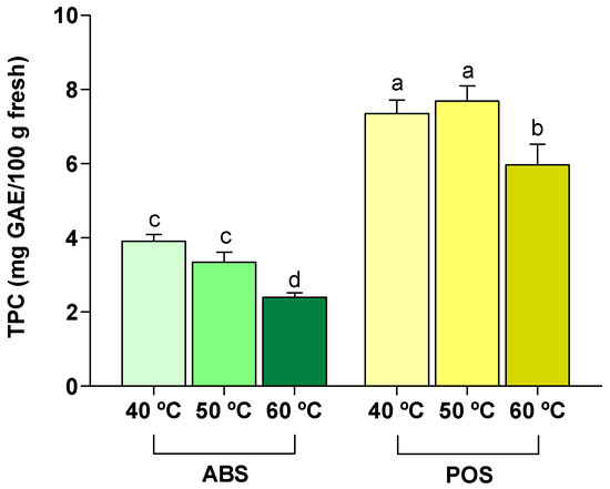 The values of total phenolic content (TPC) in both ABS and POS are shown in Figure 5. According to these results, drying temperature influenced the TPC evaluated using the Folin–Ciocalteau method (p < 0.05). Both species have no difference (p < 0.05) between 40 and 50 °C.