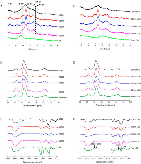 X-ray diffraction pattern of (A) UDBS, DBS, and (B) encapsulated LGG particles; 13C NMR spectra of (C) UDBS, DBS, and (D) encapsulated LGG particles; Fourier-transform infrared spectroscopy of (E) UDBS, DBS, and (F) encapsulated LGG particles. UDBS: undebranched starch; DBS30: debranched lentil starch prepared with the addition of pullulanase at a concentration of 30 NPUN/g; DBS60: debranched lentil starch prepared with the addition of pullulanase at a concentration of 60 NPUN/g; DBS90: debranched lentil starch prepared with the addition of pullulanase at a concentration of 90 NPUN/g; UDBS-LGG: UDBS-based encapsulated LGG particles; DBS30-LGG: DBS30-based encapsulated LGG particles; DBS60-LGG: DBS60-based encapsulated LGG particles; DBS90-LGG: DBS90-based encapsulated LGG particles; SA: sodium alginate; Free LGG: free Lacticaseibacillus rhamnosus GG; Amorphous: amorphous starch.