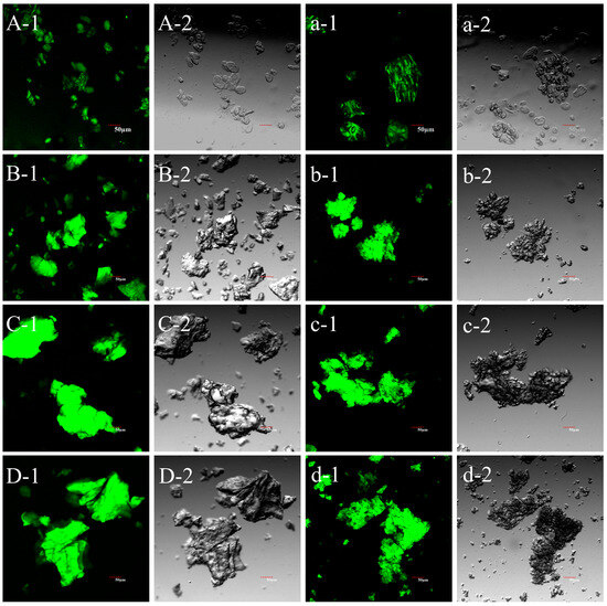CLSM images of UDBS, DBS, and encapsulated LGG particles. (A-1): undebranched starch (UDBS) (bright field); (A-2): undebranched starch (UDBS) (dark field); (B-1): debranched starch with the addition of pullulanase in the amount of 30 NPUN/g (DBS30) (bright field); (B-2): debranched starch with the addition of pullulanase in the amount of 30 NPUN/g (DBS30) (dark field); (C-1): debranched starch with the addition of pullulanase in the amount of 60 NPUN/g (DBS60) (bright field); (C-2): debranched starch with the addition of pullulanase in the amount of 60 NPUN/g (DBS60) (dark field); (D-1): debranched starch with the addition of pullulanase in the amount of 90 NPUN/g (DBS90) (bright field); (D-2): debranched starch with the addition of pullulanase in the amount of 90 NPUN/g (DBS90) (dark field); (a-1): encapsulated LGG particles based on UDBS (bright field); (a-2): encapsulated LGG particles based on UDBS (dark field); (b-1): encapsulated LGG particles based on DBS30 (bright field); (b-2): encapsulated LGG particles based on DBS30 (dark field); (c-1): encapsulated LGG particles based on DBS60 (bright field); (c-2): encapsulated LGG particles based on DBS60 (bright field); (d-1): encapsulated LGG particles based on DBS90 (bright field); (d-2): encapsulated LGG particles based on DBS90 (dark field).