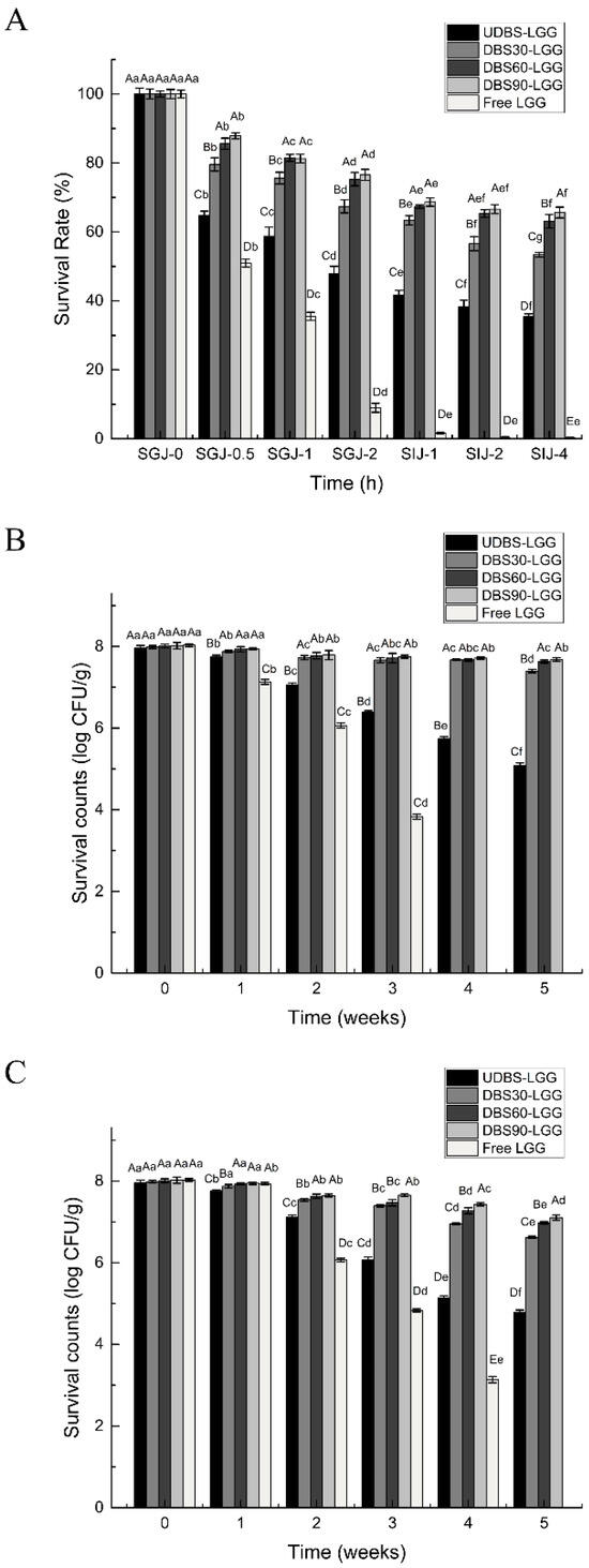 (A) Survival rate of free LGG and encapsulated LGG particles under simulated gastrointestinal juice in vitro; the storage stability of free LGG and encapsulated LGG particles at (B) 4 °C and (C) −20 °C. UDBS-LGG: UDBS-based encapsulated LGG particles; DBS30-LGG: DBS30-based encapsulated LGG particles; DBS60-LGG: DBS60-based encapsulated LGG particles; DBS90-LGG: DBS90-based encapsulated LGG particles; Free LGG: free Lacticaseibacillus rhamnosus GG. For samples stored for the same time duration (0, 1, 2, 3, 4, or 5 weeks), mean values bearing different capitalized letters are significantly different (p < 0.05) as per Duncan’s multiple comparison test. For the same sample, mean values bearing different lower-case letters are significantly different (p < 0.05) as per Duncan’s multiple comparison test.