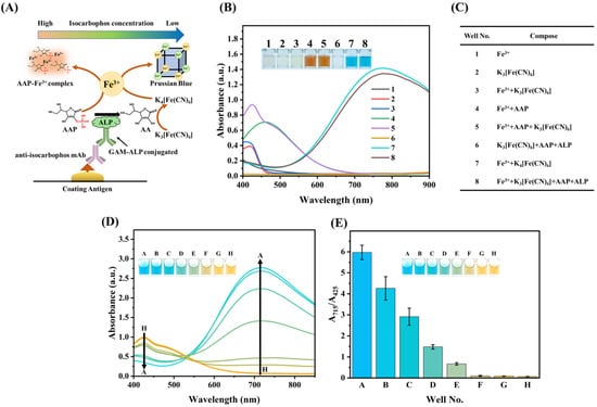 (A) The schematic diagram of the multicolor immunoassay; (B,C) the color reaction of the reagents for the development of multicolor immunoassay; (D) the absorption spectrum and (E) A715/A425 ratio for the color conversion of multicolor immunoassay.