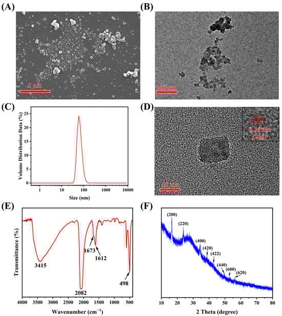 The (A) SEM and (B) TEM graph of Prussian blue; (C) the DLS analysis for Prussian blue; (D) the high-resolution image for Prussian blue and the insert graph indicated the lattice fringe of Prussian blue nanocube; the (E) FTIR and (F) XRD analysis of Prussian blue.