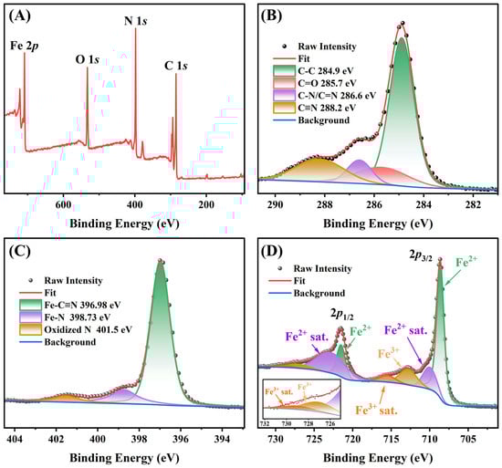 The XPS analysis of Prussian blue; (A) survey XPS spectra; (B) C 1s; (C) N 1s; (D) Fe 2p.