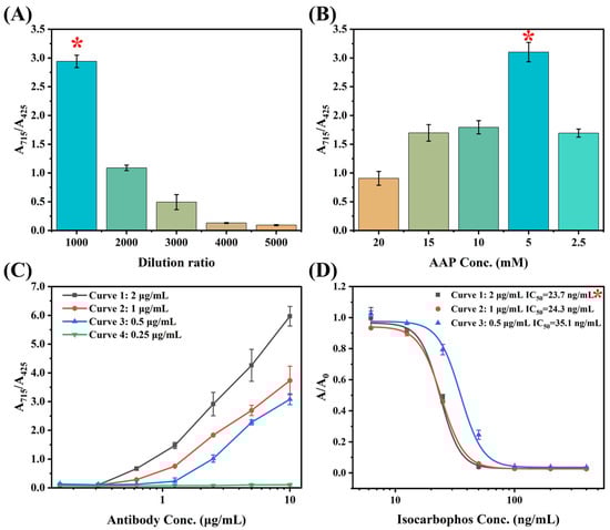 (A) The GAM-ALP dilution optimization; (B) the AAP concentration optimization; (C) the titer for multicolor immunoassay with different concentrations of coating antigen; (D) the optimization of the concentration of coating antigen. The red asterisk indicates the optimized parameter.
