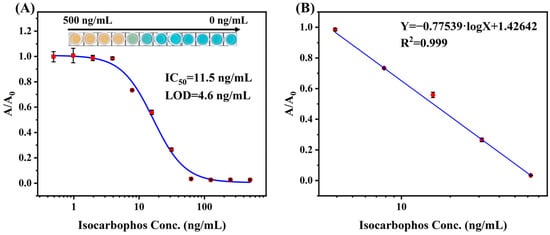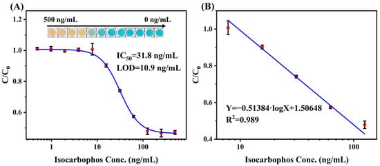 The calibration curve for multicolor immunoassay was finally created based on the optimized parameters. As shown in Figure 5A, the developed calibration curve exhibited a color conversion from orange to green and then to blue as isocarbophos concentration decreased. The calibration curve showed IC50 of 11.5 ng/mL, with the limit of detection (LOD) of 4.6 ng/mL. The linear range for the calibration curve was 3.9 ng/mL to 62.5 ng/mL, which showed good linearity (Figure 5B).