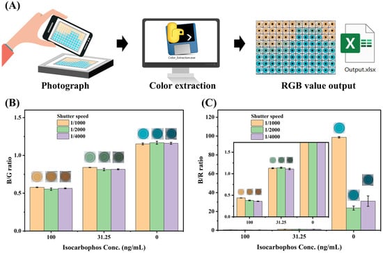 As shown in Figure 6A, the microplate was placed on the luminous panel before being photographed. The image was analyzed by “color extraction” software to measure the RGB value of the center point of each well. To verify the robustness of the RGB analysis for multicolor immunoassay, the well added with isocarbophos standard was photographed with different shutter speeds, and the RGB value was analyzed. As shown in Figure 6B,C, the B/G mode exhibited high anti-luminance interference capacity, while the B/R mode showed poor stability. Therefore, the B/G mode was used to develop RGB value analysis for multicolor immunoassay. The calibration curve of RGB analysis showed IC50 of 31.8 ng/mL with the LOD of 10.9 ng/mL (Figure 7A), and the linear range was 7.8 ng/mL to 125 ng/mL (Figure 7B), which is broader than that of microplate reader mode. Although the RGB analysis showed lower sensitivity than that of reader mode, it can achieve on-site real-time detection. Moreover, the broader linear range further improves the detection efficiency. Therefore, the RGB analysis exhibited the advantages of simplicity, convenience, and low cost, which was the alternative solution for rapid quantitative analysis. And the detection performance of this multicolor immunoassay was superior to comparable with most reported immunoassay methods for isocarbophos analysis (Table S2). The sensitivity of the developed multicolor immunoassay is higher than that of most of the methods. Moreover, the multicolor immunoassay requires no bulky microplate reader, which is suitable for on-site analysis.