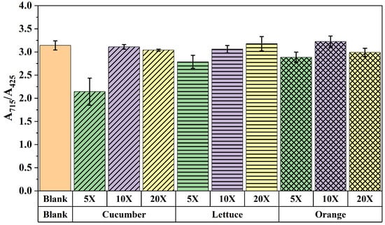 To assess the accuracy of the developed multicolor immunoassay, the recovery test was performed. Firstly, the test of the matrix effect was used to study the anti-interference capacity in real sample analysis. The sample extraction was directly diluted with PBS for multicolor immunoassay, which is simple and convenient. As shown in Figure 8, the matrix effect cloud can be completely removed with a 10-fold or 20-fold dilution for all the samples. Consequently, the optimized dilution for sample analysis was 10-fold due to the lower dilution ratio that achieved higher sensitivity than that of 20-fold. Afterward, the spiked samples were analyzed using a multicolor immunoassay, and the results are summarized in Table 1. The recoveries of reader mode and RGB mode were 81.8–112.4% and 83.3–95.9%, with the coefficient of variable (CVs) of 3.2–16.5% and 2.6–16.4%, respectively. The results of the multicolor immunoassay showed good agreement with the standard HPLC-MS/MS, which can be used for real sample tests.
