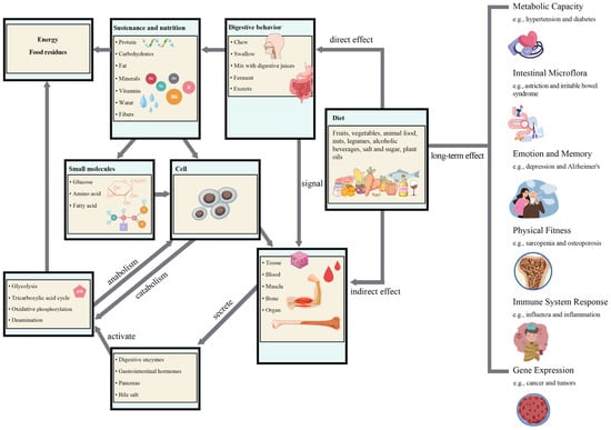 As shown in Figure 1, diet can affect human health through diverse pathways. In the short term, ingested foods pass through the digestive system, including the mouth, esophagus, stomach, and duodenum, to transfer abundant nutritional components and stimulate the skeletal and smooth muscles of the digestive organs [10]. Small molecules are assimilated by cells, whereas larger biomolecules need further breakdown by the digestive system. Concurrently, foods engage in signaling, leading to the secretions of various glands and digestive enzymes involved in both anabolic and catabolic processes, transforming foods into nutrients for cellular delivery. On the other hand, diet can influence human metabolic capacity, gut microbiota, emotions, memory, fitness levels, immune responses, etc., over the long term [11,12]. Currently, several dietary systems and guidelines have been developed in China, such as the Chinese Healthy Diet Index, Chinese Dietary Guidelines Index, Chinese Food Pagoda, and Diet Quality Divergence Index [13]. International classical dietary patterns, such as the Mediterranean, Dietary Approaches to Stop Hypertension (DASH), and vegetarian patterns, have demonstrated the relationship between diet and health [14,15]. The Mediterranean dietary pattern emphasizes a good food source of monounsaturated fatty acids (MUFA) in olive oil, accompanied with intake of vegetables, nuts, seeds, fruits, and whole grains and reductions in the consumption of red meat and unhealthy fats. In the DASH dietary pattern, the main food items are low-fat dairy and fiber-based foods, and the western dietary pattern contains more red and processed meat, butter, French fries, refined grains, deserts, potatoes, sweets, high-fat dairy, and beverages. However, those dietary patterns may not be suitable for the Chinese aging populations because of specific cultural and metabolic differences. For instance, an isocaloric-restricted dietary pattern suggested as a preventive strategy to obesity and prediabetes might have resulted in higher risk of hypoglycemia [16]. Dietary patterns that emphasized adequate fruit intake were positively associated with hypertension and systolic and diastolic blood pressure but could cause negative prognostic effects on elderly type 2 diabetes mellitus patients [17]. These facts indicate that there are some limitations when making diet recommendations if dietary patterns are relied on without consideration of the complexity of food items, which may have dual effects on human health. For example, red meat contributed to nutrient supplementation and higher protein and muscle quality, but high intake of this food increased the risk of chronic metabolic diseases [18].