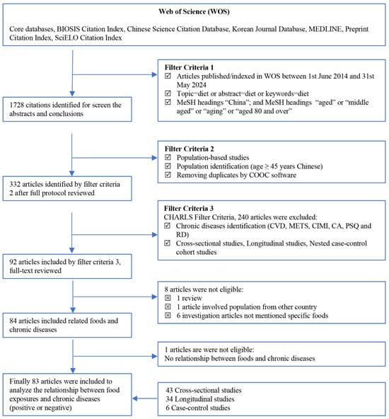 This review chose single sources to mitigate possible errors derived from bibliometric software and keep consistent the issued timing within 10 years from the database. From the original search in the WOS database (Figure 2, n = 1728 citations), 332 articles were screened using defined CHARLS filter criteria, and 92 articles were selected after exclusion. Further scrutiny of the full texts excluded eight articles and one additional study that showed no association between food consumption and chronic diseases. Consequently, a total of 83 articles were collected with all inclusion criteria, including 43 cross-sectional, 34 longitudinal (with follow-up periods ranging between 1.0 and 15.8 years), and 6 case–control studies (with follow-up periods ranging between 0.25 and 5.0 years). The study designs, participant characteristics, specific ailments or physical status, chronic diseases, exposure and outcome assessment, exposure of food groups or patterns, and main conclusions are summarized in Table 1. Among the selected studies, 42 cohort studies were conducted nationally, with sample sizes ranging between 1086 and 59,980; 26 cohort studies were provincial, with sample sizes ranging between 276 and 30,484; and 15 cohort studies were at the municipal level, with sample sizes ranging between 210 and 5281. The ages of participants ranged from 50.13 ± 4.81 to 92.9 ± 7.5 years. Food frequency questionnaires (FFQs) were used for data collection in most cohorts, other assessments included 24 h dietary recalls for 3 consecutive days, 3-day dietary records, and self-reports. Plant-based, vegetable-based, and traditional Chinese dietary patterns were common dietary patterns among local residents, and only eight studies involved western classical dietary patterns such as the Mediterranean and DASH diets [21,22,23,24,25,26,27,28].