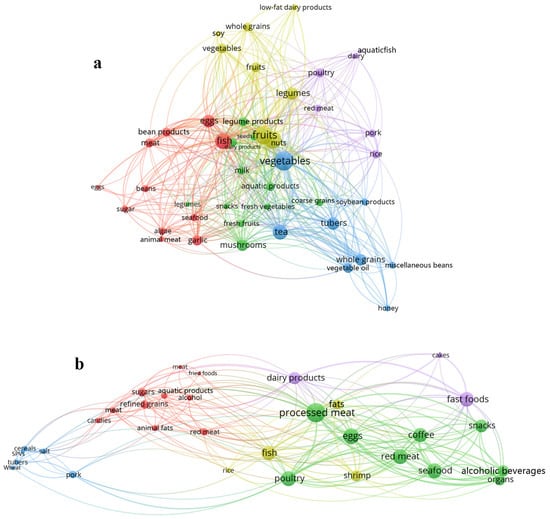 Clustering analysis of recommended food items (a) and unrecommended food items (b) based on co-occurrence matrix. Foods labeled with the same color were frequently found in similar food combinations and were associated with specific health conditions. The lines connecting the foods represent the degree of association between them, with thicker lines indicating stronger connections.