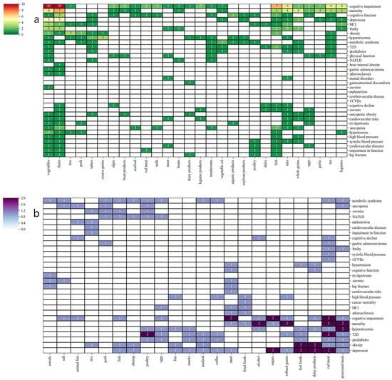 Clustering analysis of recommended food items (a) and unrecommended food items (b) in association with chronic disease symptoms based on bimodal matrix. The bimodal matrix diagram represented the relationship between food types (horizontal axis) and the physical functions of chronic diseases (vertical axis). Each cell in the matrix displayed a frequency number, reflecting the degree of association.