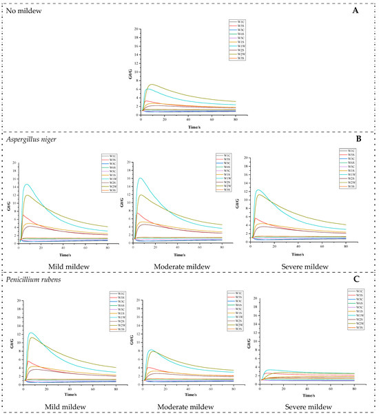 The analysis of sensor response values for moldy soybean samples inoculated with Aspergillus niger at various mold levels is presented in Figure 1A. Overall, the sensors exhibiting the highest response values are W1W (sensitive to inorganic sulfides) and W2W (sensitive to organic sulfides), followed by W5S (highly sensitive to nitrogen oxides), W1S (sensitive to short-chain alkanes such as methane), and W2S (sensitive to alcohols, ethers, aldehydes, and ketones). Notably, W1W and W2W demonstrate the most pronounced responses in the cases of mild and moderate mold. This indicates that the concentrations of organic sulfides, inorganic sulfides, and nitrogen compounds are relatively high in the moldy soybean samples inoculated with Aspergillus niger.