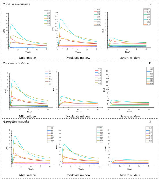 Figure 1E presents the analysis of sensor response values for moldy soybean samples inoculated with Aspergillus versicolor at various mold levels. Under mild and moderate mold conditions, the sensors with the highest response values are W1W (sensitive to inorganic sulfides) and W2W (sensitive to organic sulfides). These are followed by W5S (highly sensitive to nitrogen oxides), W1S (sensitive to short-chain alkanes such as methane), and W2S (sensitive to alcohols, ethers, aldehydes, and ketones). This indicates that in the moldy soybean samples inoculated with Aspergillus versicolor, the relative concentrations of organic sulfides, inorganic sulfides, and nitrogen compounds are higher under mild and moderate mold conditions. Conversely, under other conditions, the concentrations of these substances are relatively low.