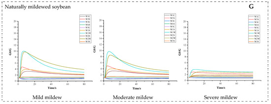 Figure 1F presents the analysis of sensor response values for naturally moldy soybean samples at various mold levels. The sensors with the highest response values are W1W (sensitive to inorganic sulfides) and W2W (sensitive to organic sulfides), followed by W5S (highly sensitive to nitrogen oxides), W1S (sensitive to short-chain alkanes such as methane), and W2S (sensitive to alcohols, ethers, aldehydes, and ketones). However, under severe mold conditions, the responses of all sensors are weak, with deviation values below 4. This indicates that while the concentrations of organic sulfides, inorganic sulfides, and nitrogen compounds are relatively high in naturally moldy soybean samples, they are comparatively low under severe mold conditions.