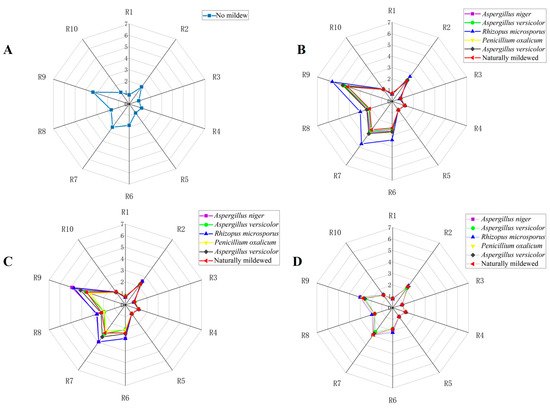 Figure 2. Comparative analysis of response values of soybean sensors with different molds. (A) No mildew; (B) Mild mildew; (C) Moderate mildew; (D) Severe mildew.
