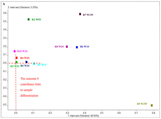 Figure 3A illustrates the contribution rate analysis of the ten E-nose sensors using the Loadings algorithm. The contribution rate of the first principal component is 92.93%, while that of the second principal component is 5.33%, indicating that the primary differences among the sensors are reflected in the first principal component. Notably, the W2W sensor (sensitive to organic sulfur compounds) contributes the most to the first principal component, followed by W1W (sensitive to inorganic sulfur compounds), W1S (sensitive to methane and other short-chain alkanes), and W2S (sensitive to alcohols, ethers, aldehydes, and ketones). The sensors significantly contributing to the second principal component are W1W and W5S (sensitive to small molecular nitrogen compounds). These results suggest that during the molding process, soybeans produce substantial amounts of both inorganic and organic sulfur compounds, along with smaller quantities of alcohols, ethers, aldehydes, ketones, nitrogen compounds, and short-chain alkanes such as methane.