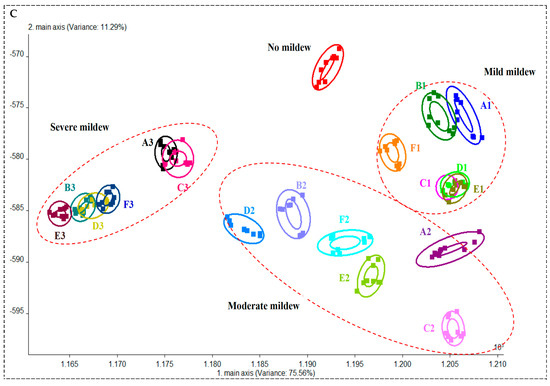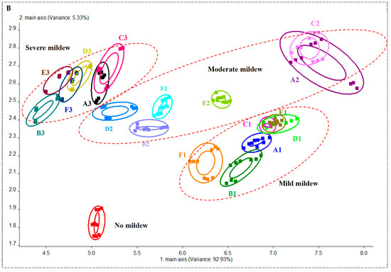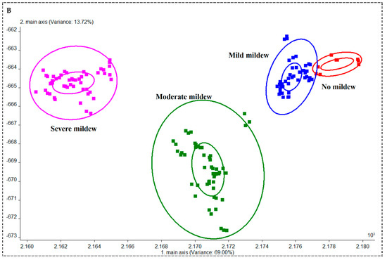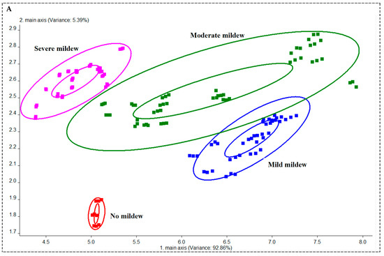 Figure 4A displays the PCA score plot for soybean samples at various mold levels, showing that the first and second principal components account for 98.25% of the data variance, with the first component alone contributing 92.86%. The clear separation between non-moldy and moldy soybean samples indicates that PCA is effective in distinguishing mold presence. Additionally, the sample points for light, moderate, and severe mold are grouped distinctly along the X-axis, with no overlap, demonstrating a clear pattern. These findings suggest that PCA can successfully differentiate soybean samples based on mold levels.