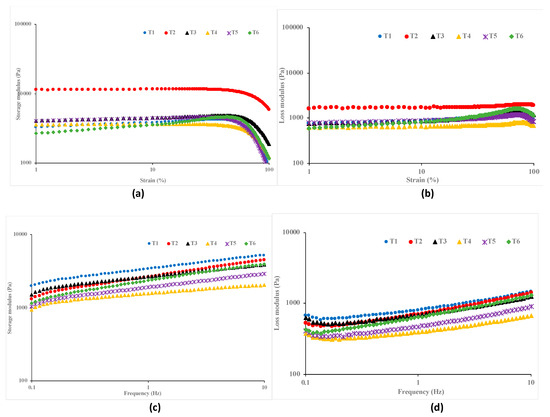Rheological linear test of hummus (T1: hummus + No Garlic + No chitosan (control), T2: hummus + No Garlic + 0.5% chitosan, T3: hummus + No Garlic + 1.0% chitosan, T4: hummus + 1% Garlic + No chitosan, T5: hummus + 1% Garlic + 0.5% chitosan, T6: hummus + 1% Garlic + 1.0% chitosan). (a) Storage modulus, strain (%); (b) Loss modulus, strain (%); (c): Storage modulus, Frequency (Hz); (d) Loss modulus, Frequency (Hz).