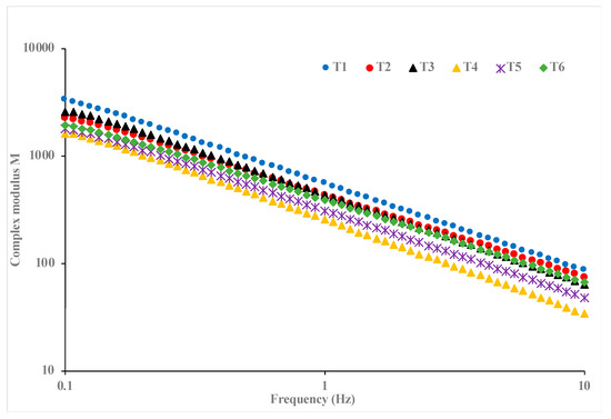 A strain sweep test and frequency sweep test were used to analyze the linear viscoelastic region. A strain range of 0.01–10% was used at a constant frequency of 1.0 Hz. A linearity of 0.3% was observed and thereby used for later tests. Similarly, for the frequency sweep test, a frequency range of 0.1 and 50 Hz and a constant strain of 0.3% within the linear viscoelastic region were utilized.
