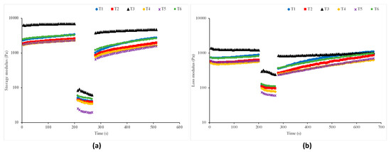 Thixotropic behavior of hummus [(a): G′ and (b): G″] (T1: hummus + No Garlic + No chitosan (control), T2: hummus + No Garlic + 0.5% chitosan, T3: hummus + No Garlic + 1.0% chitosan, T4: hummus + 1% Garlic + No chitosan, T5: hummus + 1% Garlic + 0.5% chitosan, T6: hummus + 1% Garlic + 1.0% chitosan).