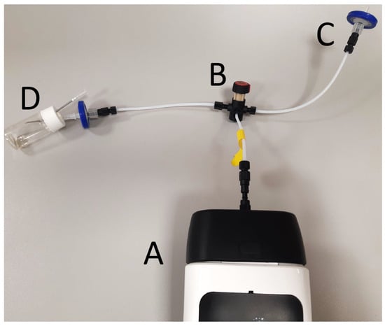 Operation setting of the electronic nose. Tubing is connected to the electronic nose (A) with a switcher (B). Membrane filters (C) provide filtered air. The headspace of a 20 mL glass vial holding 1 mL sample is taken through a needle; an extra needle provides air to avoid creating a vacuum (D).