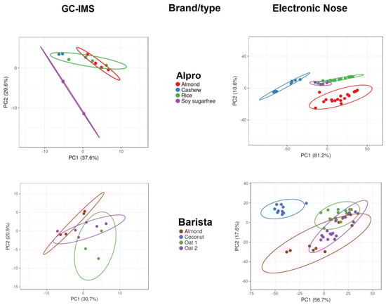 Principal component analysis results of gas chromatography with ion mobility spectroscopy (GC-IMS) and electronic nose measurements of plant-based drinks according to brand and type.