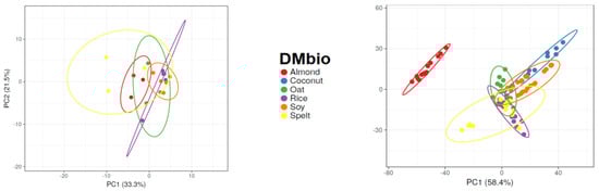 Both GC-IMS and electronic nose approaches are able to precisely and thoroughly detect volatile organic compounds [21]. Volatile compounds have been successfully used to identify the primary sources of various plant-based drinks, including rice [22], oat [23], almond [24], coconut [25], soy [26], cashew [27], and cereals [28]. Volatile compounds have also been successfully used to identify additional ingredients in plant-based drinks, such as sunflower oil [29], pea protein [30], algae [31], grape juice [32], and agave syrup [33]. For example, these approaches have been used to successfully differentiate among room-temperature yogurt, non-fermented plant-based drinks, and fermented plant-based drinks made from walnut and purple rice, with complete separation visible when PCA was applied to electronic nose results and GC-IMS gallery plots [34]. Our comprehensive study demonstrates that the presence of volatile organic compounds identified using GC-IMS or electronic nose approaches heavily influences the PCA-based differentiation of plant-based drinks.