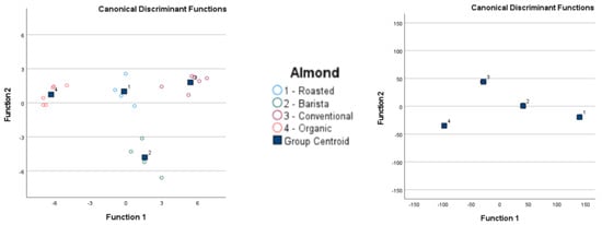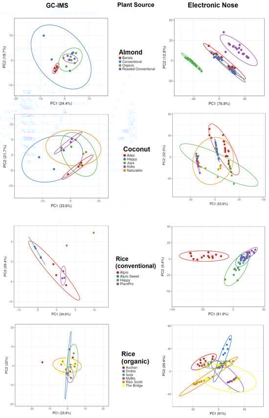 GC-IMS of almond-based samples was able to separate barista samples from roasted conventional samples, but no complete separation was possible when all almond-based samples were analyzed together. The electronic nose analysis of almond-based samples was able to separate organic and roasted conventional samples from all other almond-based samples, but an overlap occurred between barista and conventional samples. GC-IMS analysis of coconut-based samples was unable to completely separate any sample when all samples were analyzed, but separation was observed between the Adez and Koko samples. The electronic nose was also unable to completely separate any coconut-based samples when all samples were analyzed, but separation was observed between the Koko and Happy samples and between the Koko and Adez samples. GC-IMS analysis of conventional rice samples was able to completely separate the Happy sample from all other samples, and separation was observed between the sweetened Alpro and PlantPro samples. The electronic nose was also able to completely separate Alpro conventional rice samples from all other samples, but overlap was observed among the sweetened Alpro, Happy, and PlantPro samples. GC-IMS analysis was able to separate Auchan organic rice samples from MyBio organic rice samples, but incomplete separation was observed when all organic rice samples were assessed. The electronic nose was able to separate Auchan organic rice samples from Riso Scotti and DMbio organic rice samples, but no complete separation was visible when all organic rice samples were assessed.