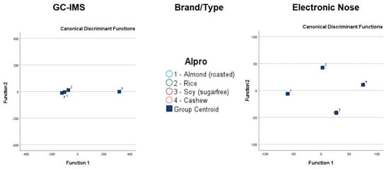 Linear discrimination analysis classification of gas chromatography with ion mobility spectroscopy (GC-IMS) and electronic nose analysis of plant-based drinks according to brand and type.